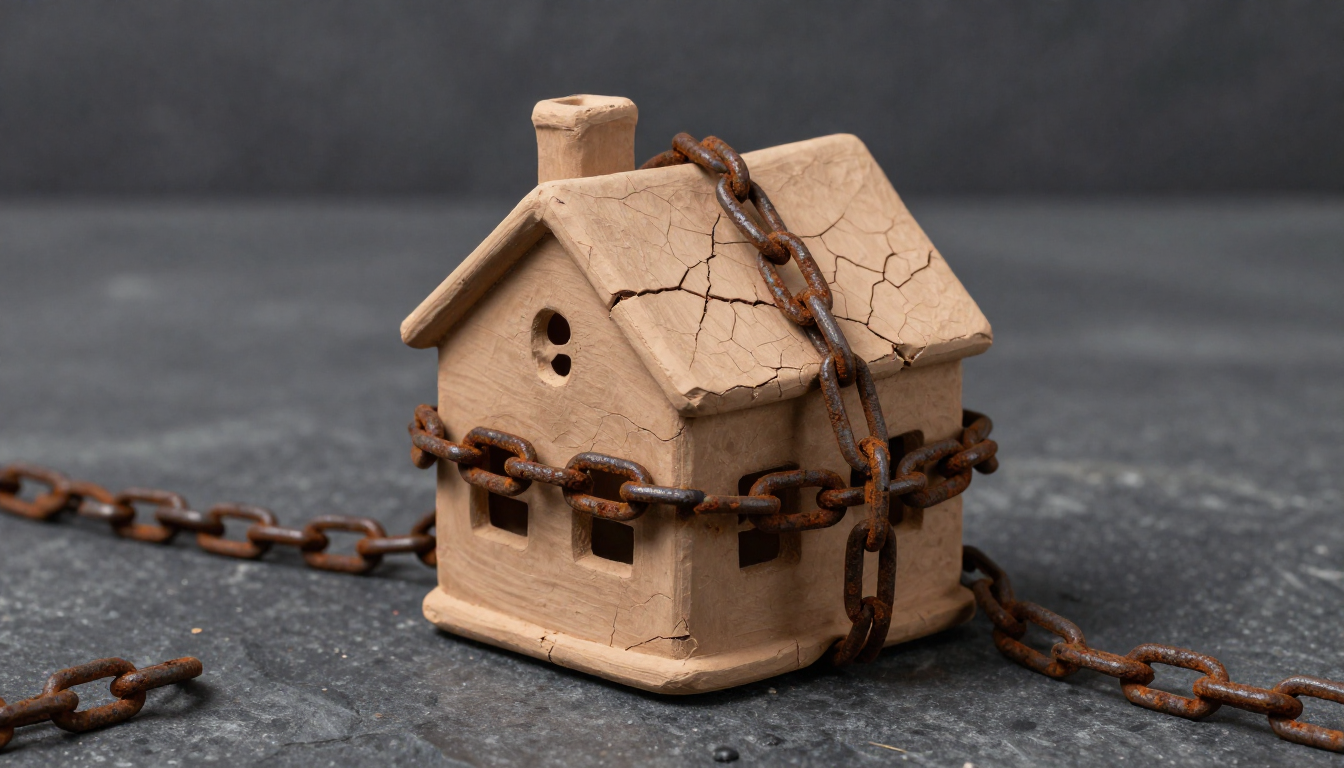 어두운 돌 바닥 위 쇠사슬에 묶여 균열이 생긴 찰흙 집 모형이 놓여 있는 모습.