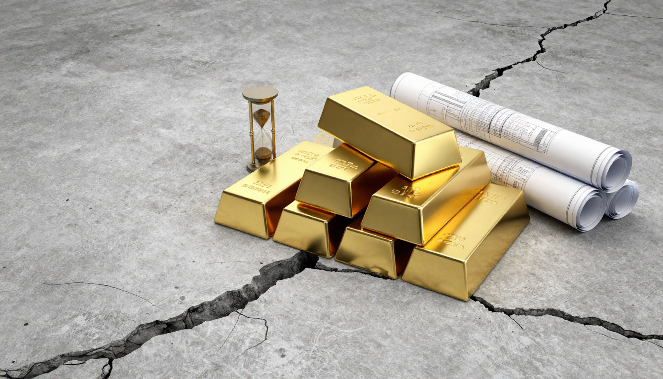갈라진 콘크리트 바닥 위 위태롭게 쌓인 금괴와 모래시계, 설계도 도면들이 놓여 있는 실사 이미지.